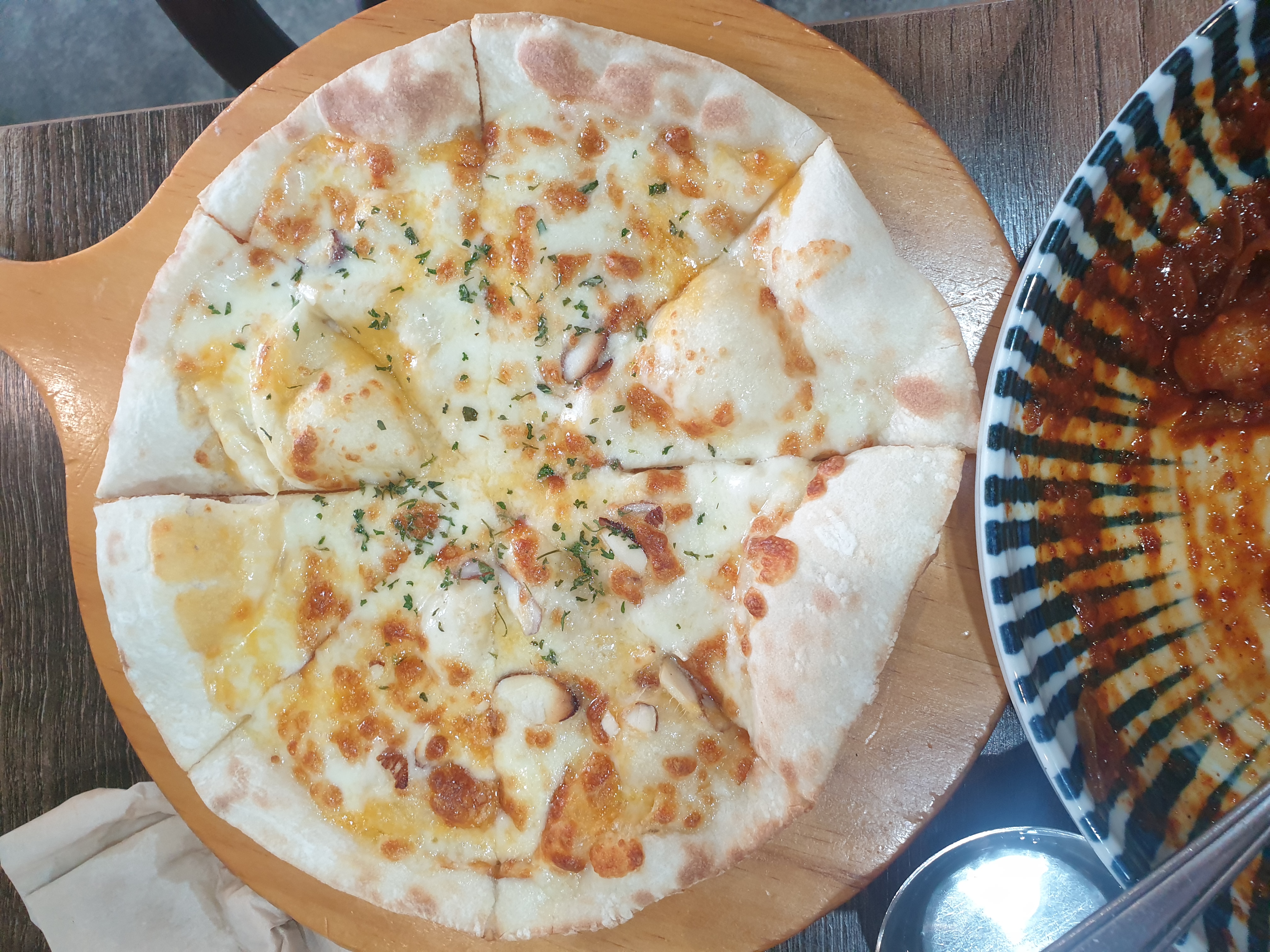 불 맛이 나는 쫄깃한 쭈구미를 야채와 함께 비벼 먹고 따뜻한 피자를 꿀에 찍어 먹으니 정말 맛있네요.